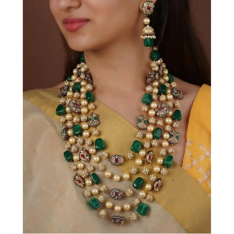 This is an elaborate multi-layered traditional necklace set paired with statement jhumka earrings, designed in a regal Indian heritage style. The composition blends pearls, green stones, and antique-finish metal elements to create a rich, festive aesthetic.
