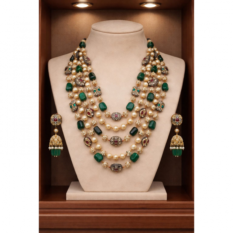 The rich layering and gemstone combination evoke a royal vintage aesthetic inspired by classic Indian heritage jewellery.