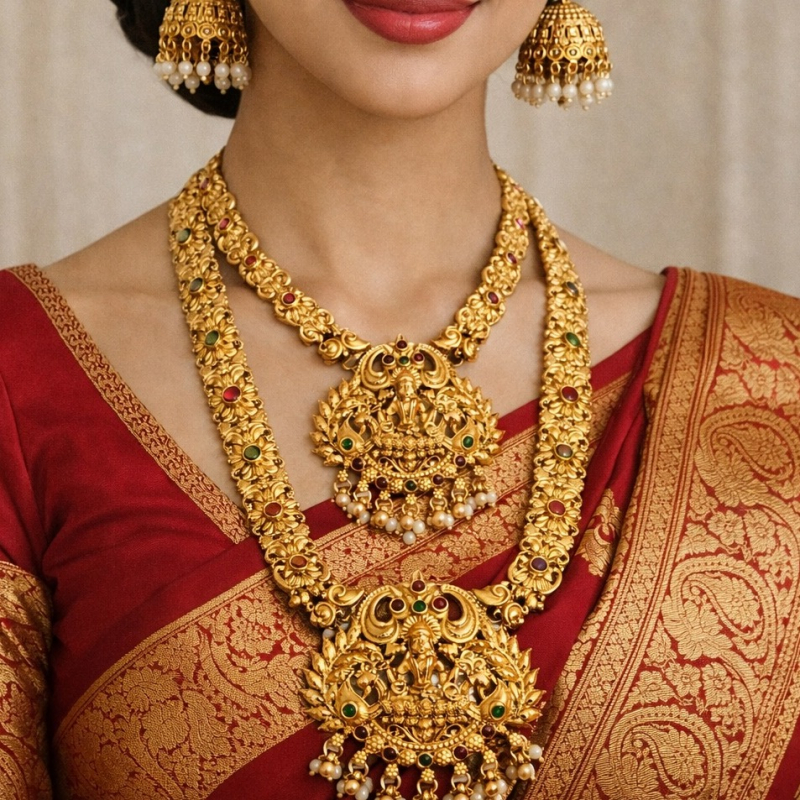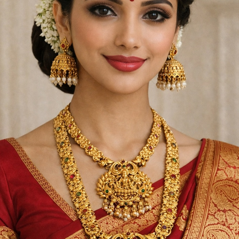 This exquisite bridal jewellery set is the epitome of timeless elegance, crafted to make every woman feel like royalty on her special day. The set features a stunning long necklace adorned with intricate temple-inspired motifs, showcasing a magnificent Goddess Lakshmi pendant surrounded by vibrant ruby red and emerald green stones, complemented by lustrous pearl drops. The matching jhumka earrings echo the necklace's grandeur with their layered bell-shaped design, colourful stone accents, and delicate pearl danglers. Finished in a rich, high-polish golden tone, this set pairs beautifully with silk sarees, lehengas, and traditional bridal attire. Ideal for weddings, engagements, and festive celebrations, this three-piece jewellery set is a perfect blend of heritage craftsmanship and contemporary bridal styling. The set includes a necklace and a pair of earrings, all presented together for a cohesive, luxurious look. Please check sizing and weight details before ordering.