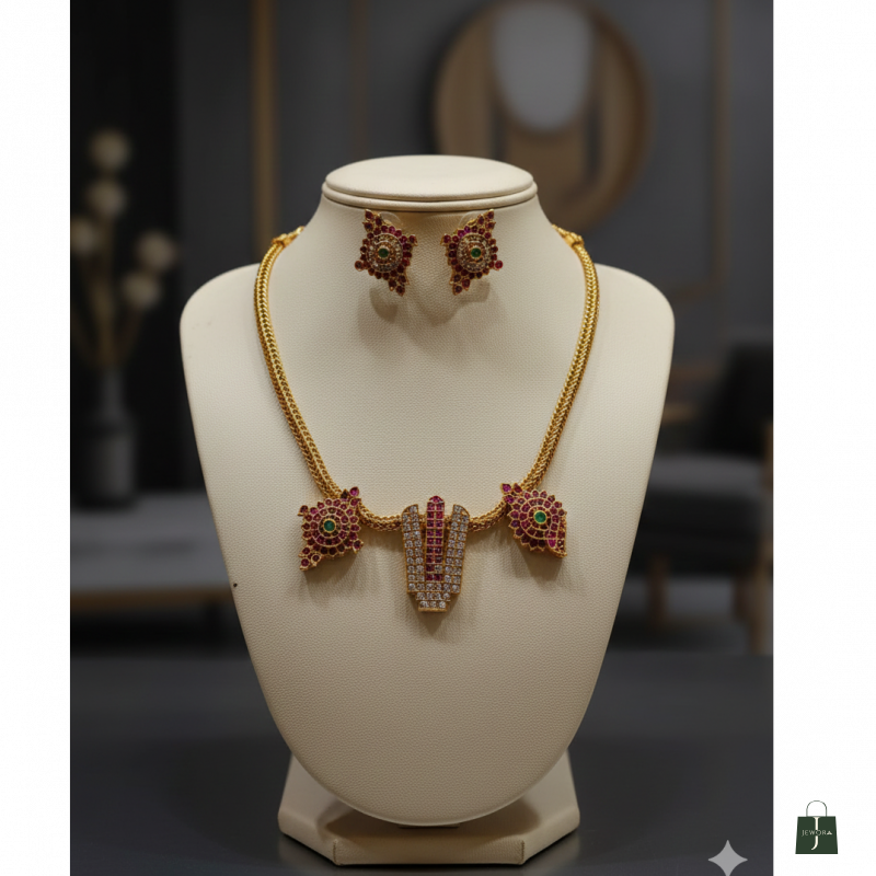 Matching Earrings: The set includes elegant star or flower-shaped stud earrings that perfectly echo the ruby and CZ stone setting of the necklace, completing the divine ensemble.