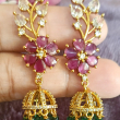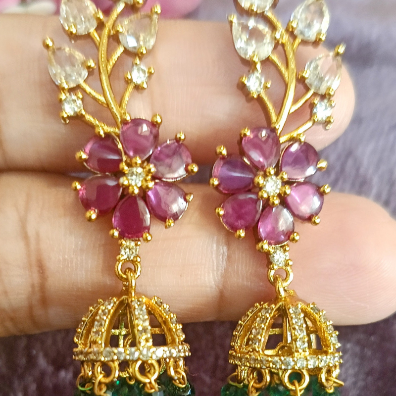 This trendy earring is a Jadau Kundan Jhukka,a traditional Indian earring known for its intricate stone settings and bell shaped dangle.This piece features a floral stud with pink stones and a branch like accent above it set with clear white stones embellished with vibrant green bead drops.