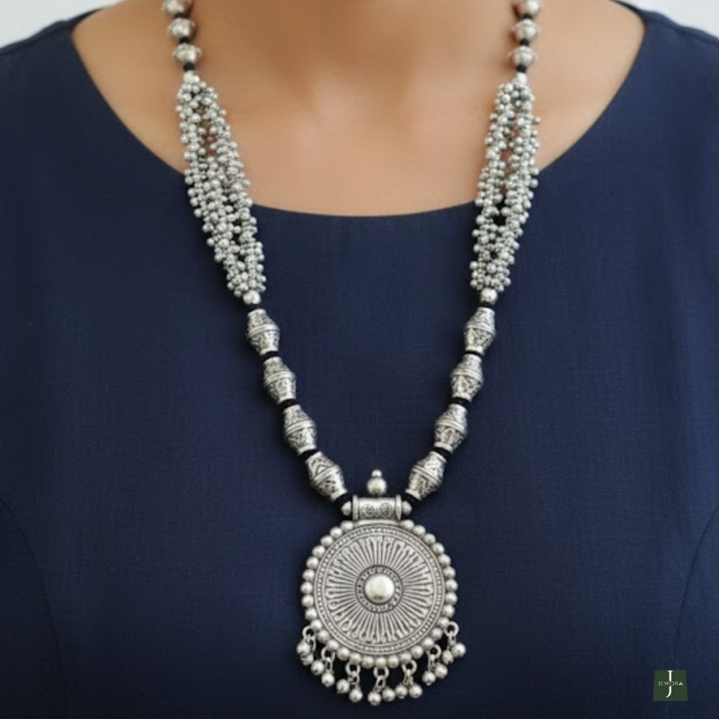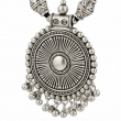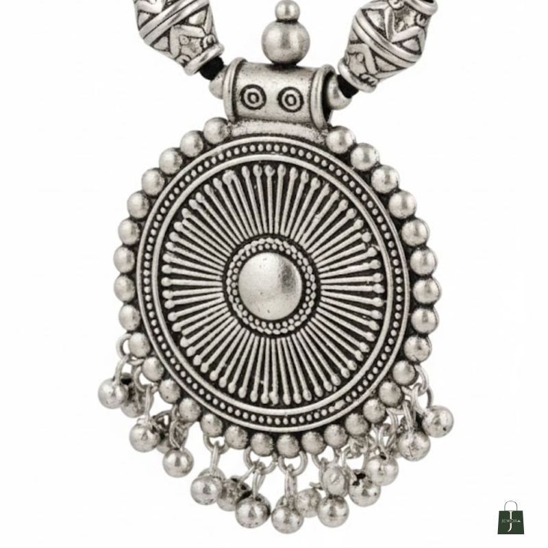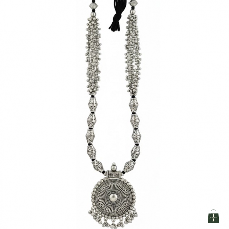 A beautifully handcrafted tribal-style oxidised necklace featuring intricate beads, layered detailing, and a bold circular pendant. Perfect for adding a striking ethnic touch to both everyday and festive outfits.