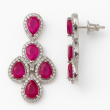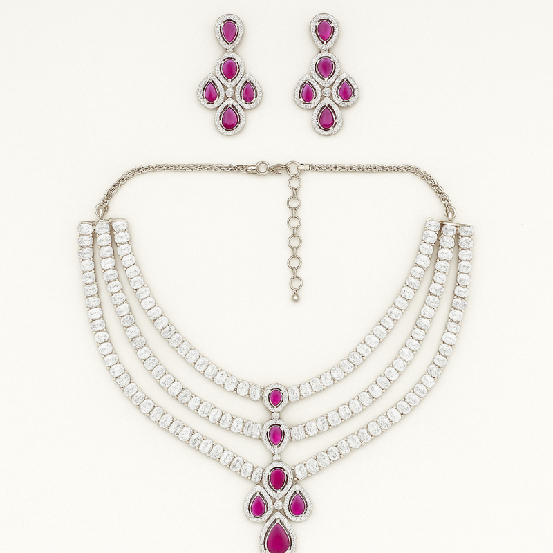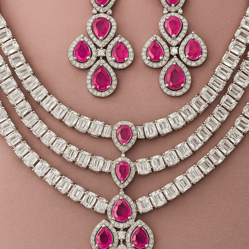 Turn heads with the stunning Triple Layer Cascade Necklace Set, a perfect fusion of modern design and timeless elegance. Featuring three layers of shimmering American Diamonds that gracefully encircle the neckline, this set exudes opulence. The centerpiece showcases brilliant ruby red stones in teardrop and oval cuts, accentuated with delicate diamond halos that enhance their brilliance. The matching drop earrings are designed with the same ruby-diamond combination, creating a flawless harmony between the necklace and earrings.