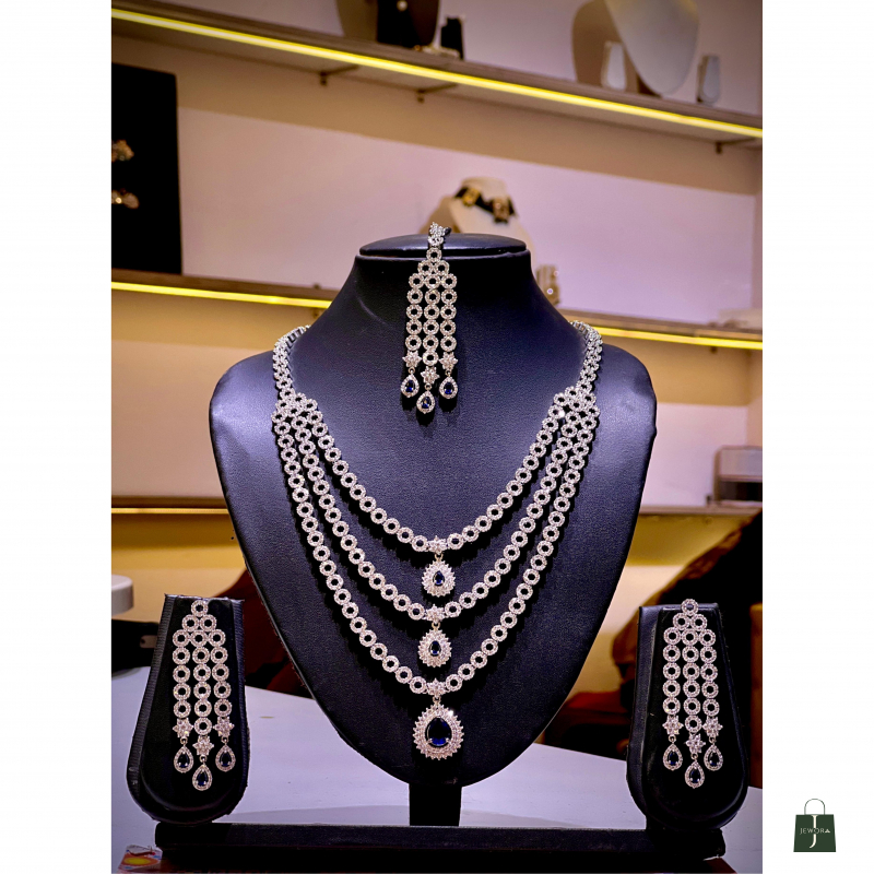 The overall look of the set is traditional yet opulent, making it ideal for weddings or grand ceremonial occasions. The combination of shimmering white stones with rich deep-blue gems adds a regal touch.