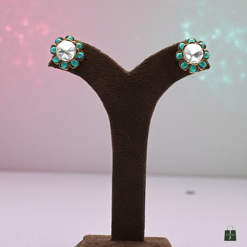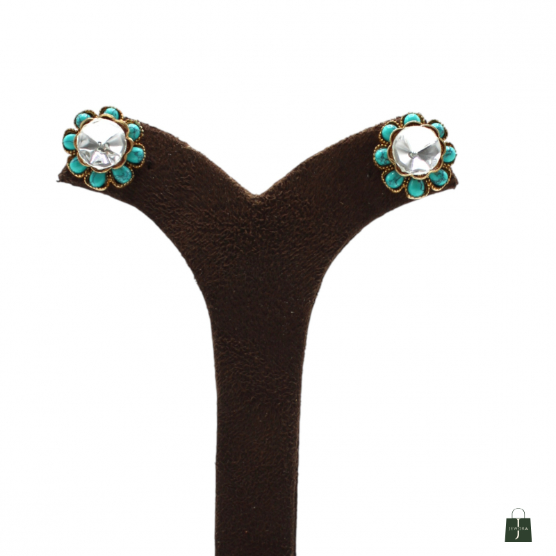 Add a fresh pop of color to your ethnic collection with these elegant turquoise floral stud earrings. Designed in a delicate flower pattern, each earring features a reflective polki-style mirror stone at the center, surrounded by vibrant turquoise petal accents. The antique gold base enhances the traditional charm while keeping the look classy and minimal.