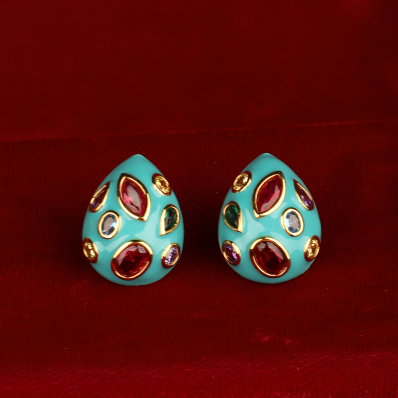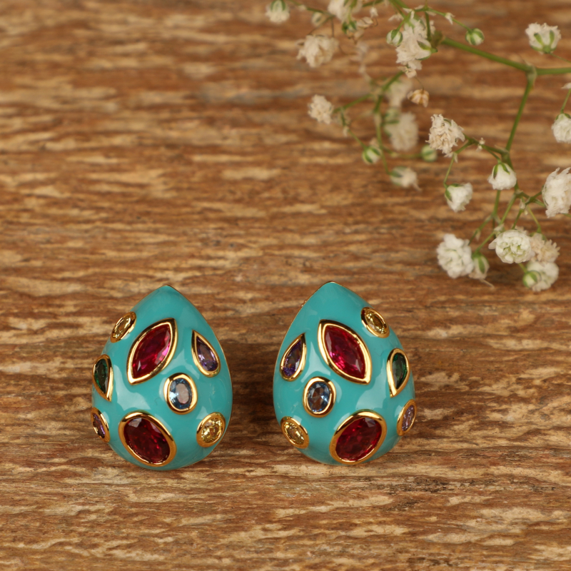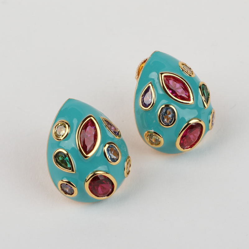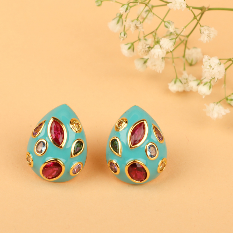 Add a pop of colour and modern elegance to your look with these statement stud earrings. Designed in a soft turquoise enamel base, the earrings are accented with multi-shaped crystal embellishments in rich ruby, emerald, and champagne tones. The teardrop silhouette creates a bold yet refined profile, while the gold-tone detailing adds a luxurious finish.