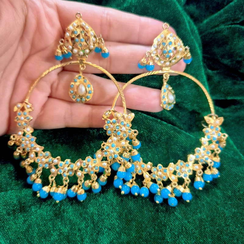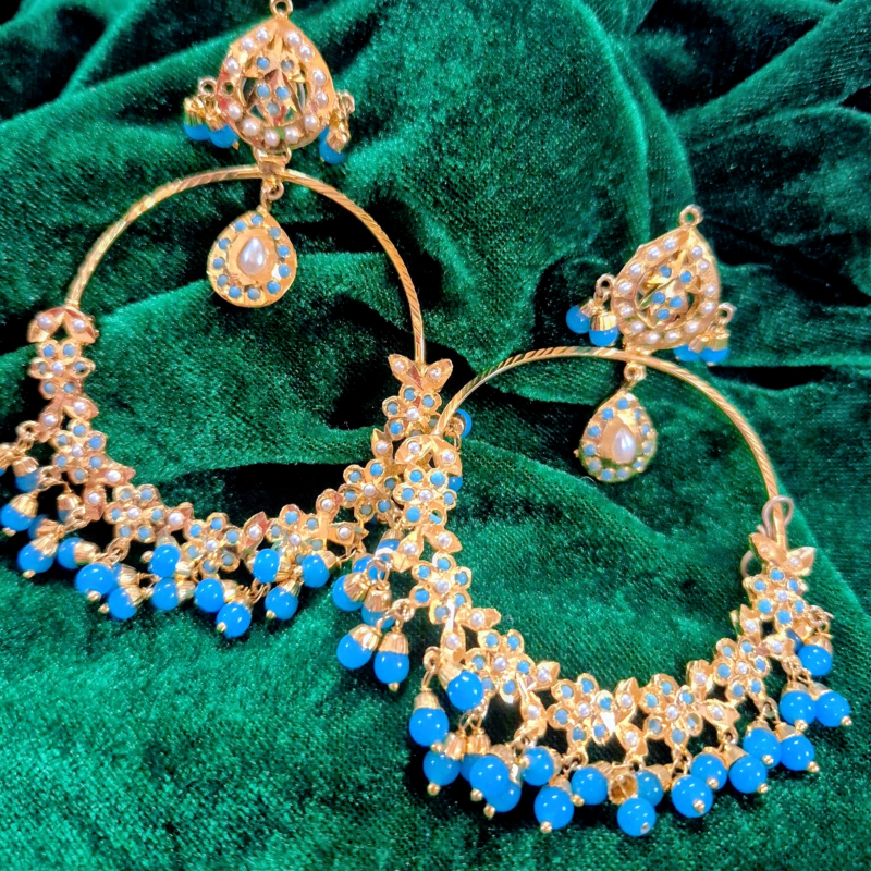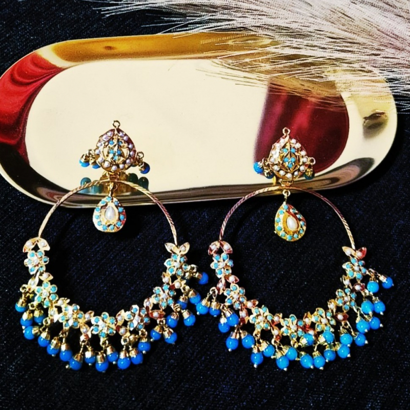 Add a vibrant royal touch to your ethnic look with these stunning turquoise Kundan chandbali earrings. Designed with intricate detailing, these earrings feature shimmering Kundan stones beautifully accented with bright blue beads and subtle pearl drops. The elegant crescent shape paired with delicate hanging elements creates graceful movement and a rich traditional appeal. Perfect for weddings, festive occasions, and cultural celebrations, these earrings are a perfect blend of color, elegance, and heritage craftsmanship.