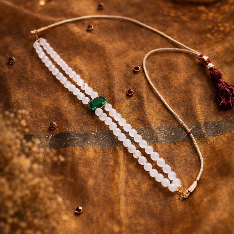 Crafted with delicate onyx beads, this elegant choker is a beautiful expression of subtle sophistication. At its center lies a captivating green stone locket, adding richness and depth to the design. The contrast between the soft sheen of the beads and the vibrant emerald-toned centerpiece creates a look that is both graceful and eye-catching.