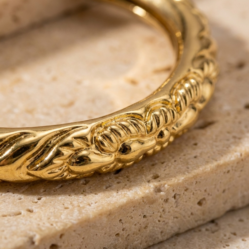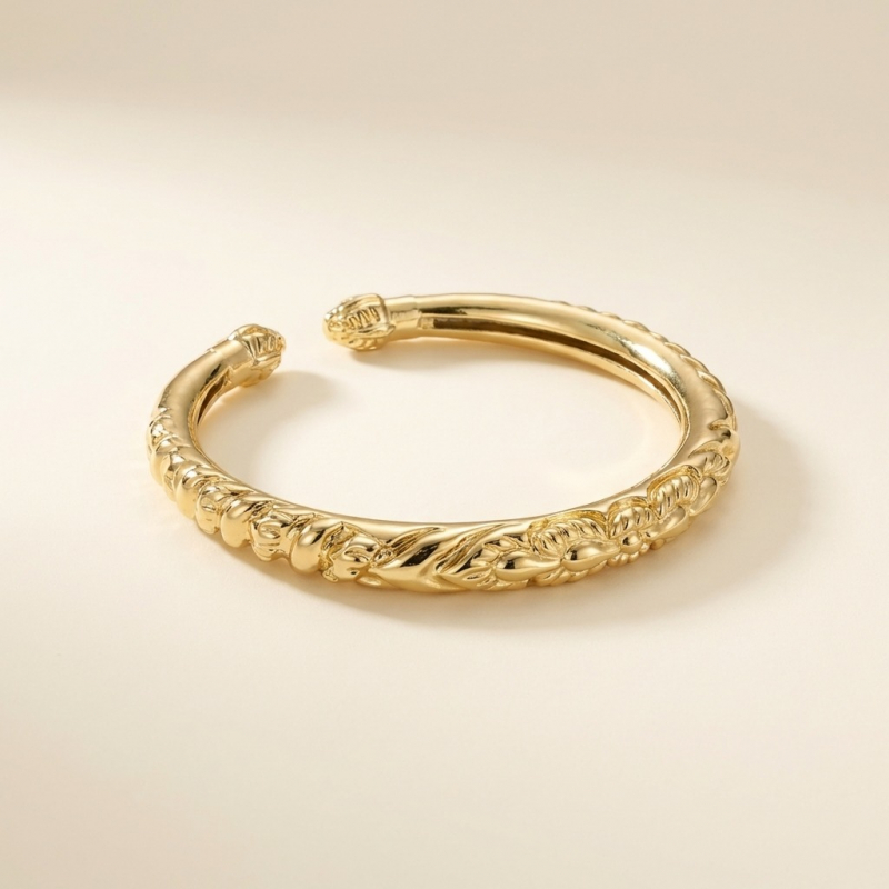 Motif: The bracelet displays a high-relief, embossed floral or vine-like pattern that wraps around the outer circumference. The design feels traditional yet polished, blending classic artisanal textures with a modern metallic sheen.