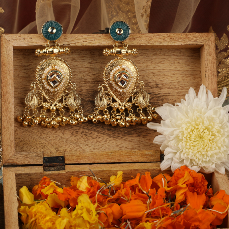 Make a statement with these exquisitely handcrafted traditional earrings that celebrate intricate artistry and graceful movement. The design features a serene turquoise-toned stud at the top, accented with a subtle central stone, leading into a richly engraved gold-finish drop. At the heart of the drop sits a classic kundan-style element, framed with delicate pearl detailing that adds softness and refinement.