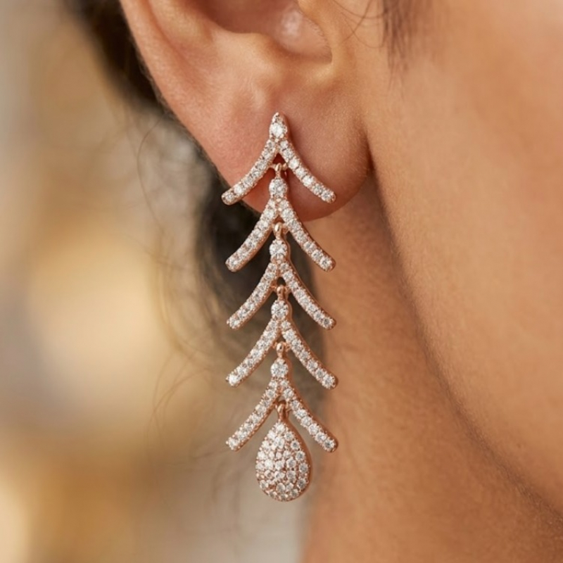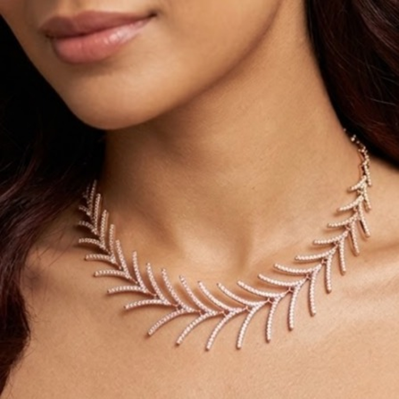 Elegant V-shape necklace with beautiful rose gold polish and sparkling stones. Comes with matching dangler earrings. Perfect for parties, weddings, and special occasions.