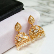 The Vahini Polki Jhumka Earrings feature traditional polki-style diamond stones set in a rich gold-tone finish, crafted into an elegant floral stud and classic dome-shaped jhumka. Finished with delicate emerald-green bead accents and pearl drops, these earrings offer a perfect blend of royal charm and timeless grace. Ideal for weddings, festive occasions, and ethnic wear, they pair beautifully with sarees, lehengas, and anarkalis for a refined traditional look.