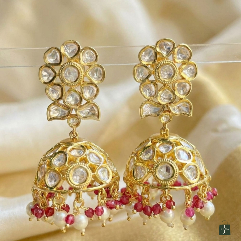 The Vahini Polki Jhumka Earrings feature traditional polki-style diamond stones set in a rich gold-tone finish, crafted into an elegant floral stud and classic dome-shaped jhumka. Finished with delicate emerald-green bead accents and pearl drops, these earrings offer a perfect blend of royal charm and timeless grace. Ideal for weddings, festive occasions, and ethnic wear, they pair beautifully with sarees, lehengas, and anarkalis for a refined traditional look.