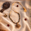 Elegant and timeless, the Vaidehi Necklace showcases deep green stones beautifully set in intricate antique-finish detailing, reflecting classic Indian craftsmanship. The design is enhanced by a delicate temple-inspired pendant, adorned with graceful pearl drops that add a touch of traditional charm and sophistication.