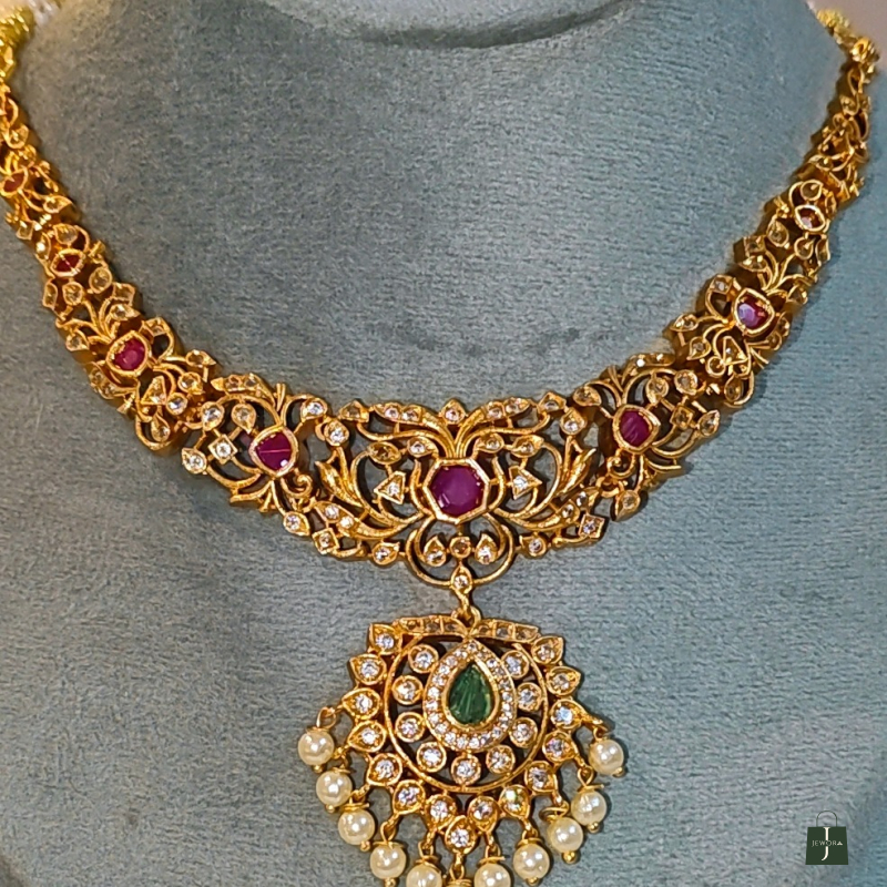 Elevate your ethnic elegance with this exquisitely crafted Kundan-style necklace set, inspired by timeless Indian heritage. Designed in a rich antique gold finish, the necklace showcases intricate floral and vine motifs adorned with sparkling white stones, deep ruby accents, and a striking emerald-green centerpiece that adds regal charm.