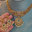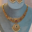 The highlight of the necklace is its beautifully detailed pendant with a teardrop green stone, encircled by shimmering crystals and finished with delicate pearl danglers that sway gracefully with every movement. The matching earrings mirror the same craftsmanship, featuring coordinated stones and pearl drops for a perfectly balanced, traditional look.