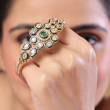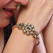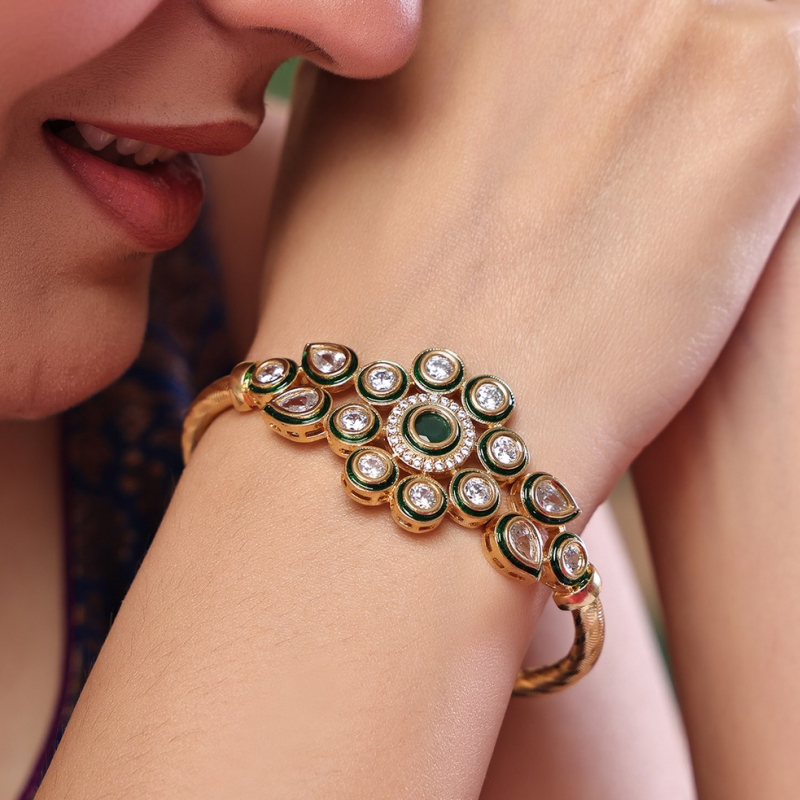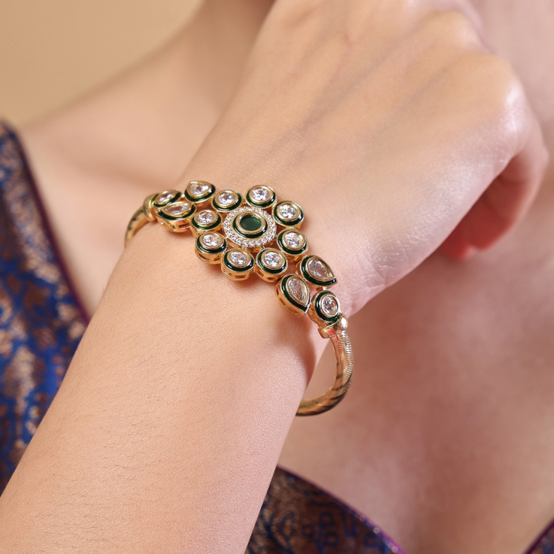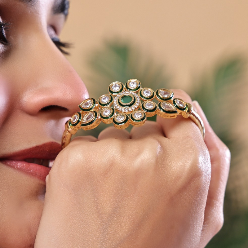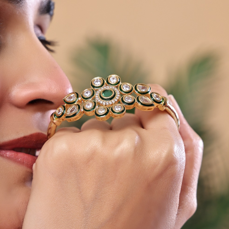 Elevate your ethnic style with this elegant floral kundan open kada, designed to add a touch of sophistication and charm. The centerpiece features a rich emerald-green stone encircled by sparkling kundan stones, beautifully outlined with green enamel accents for a refined finish. The delicate petal arrangement creates a blooming floral look, while the sleek gold-toned band adds a modern twist. Perfect for festive occasions or everyday elegance, this bracelet blends tradition with contemporary grace.