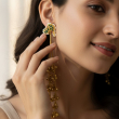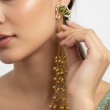 Elevate your ethnic ensemble with the regal charm of the Varnikha Emerald Cascade Long Earrings. Designed with a temple-inspired aesthetic, these earrings feature a beautifully detailed top motif adorned with rich emerald-green stones arranged in a graceful leaf pattern.