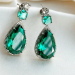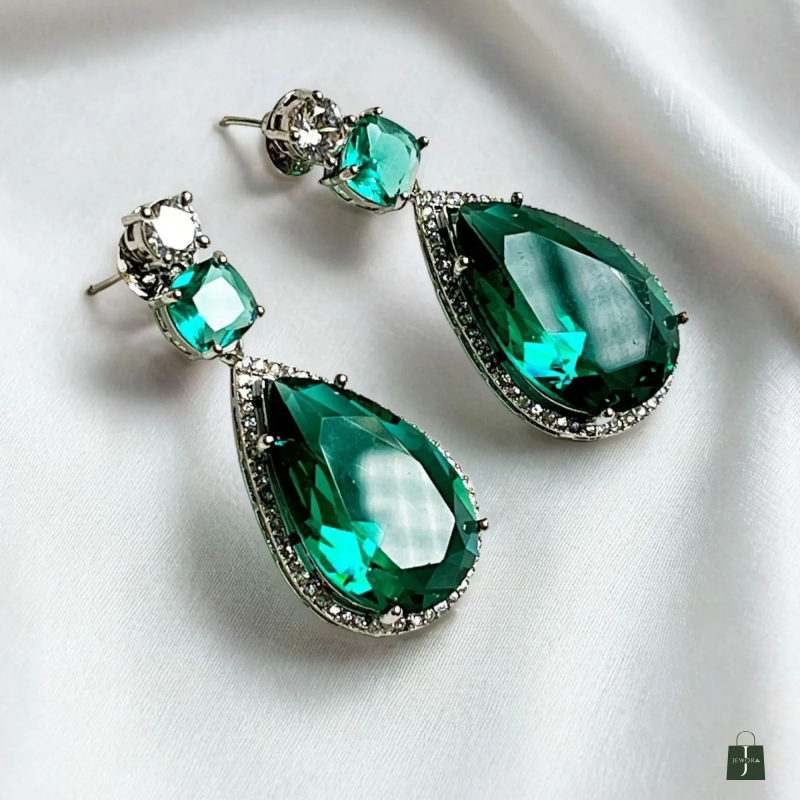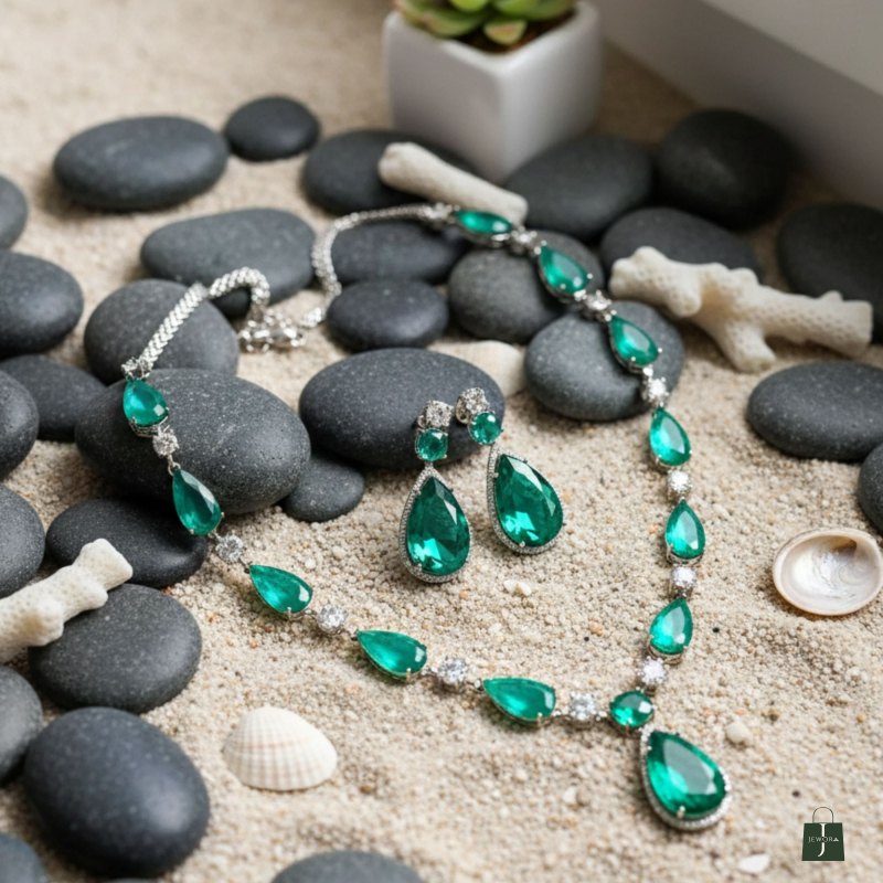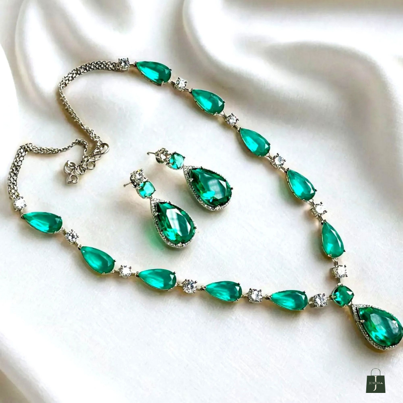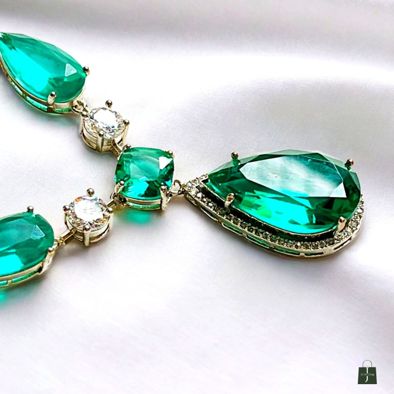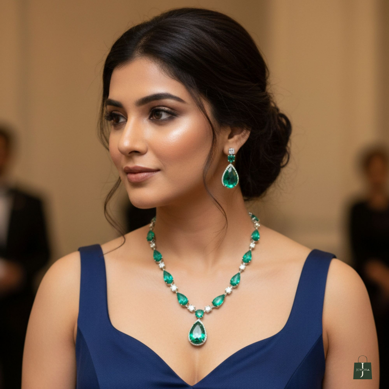 The VERDANTE Drop Diamond Emerald Necklace Set features elegant pear-shaped emerald-green stones delicately linked with sparkling diamond-style accents for a refined, modern look. Finished with a graceful drop pendant and matching earrings, this lightweight set offers effortless sophistication. Perfect for cocktail evenings, receptions, festive gatherings, and contemporary bridal styling, it pairs beautifully with sarees, gowns, and pastel ethnic wear, making it an ideal choice for those who love understated luxury.
