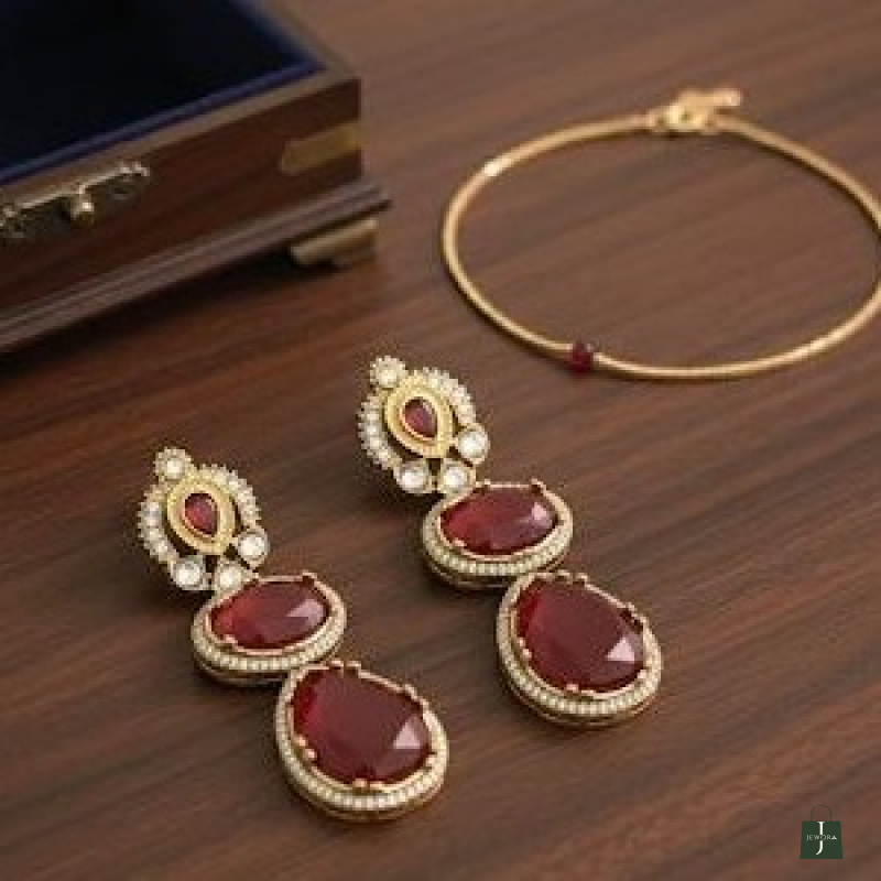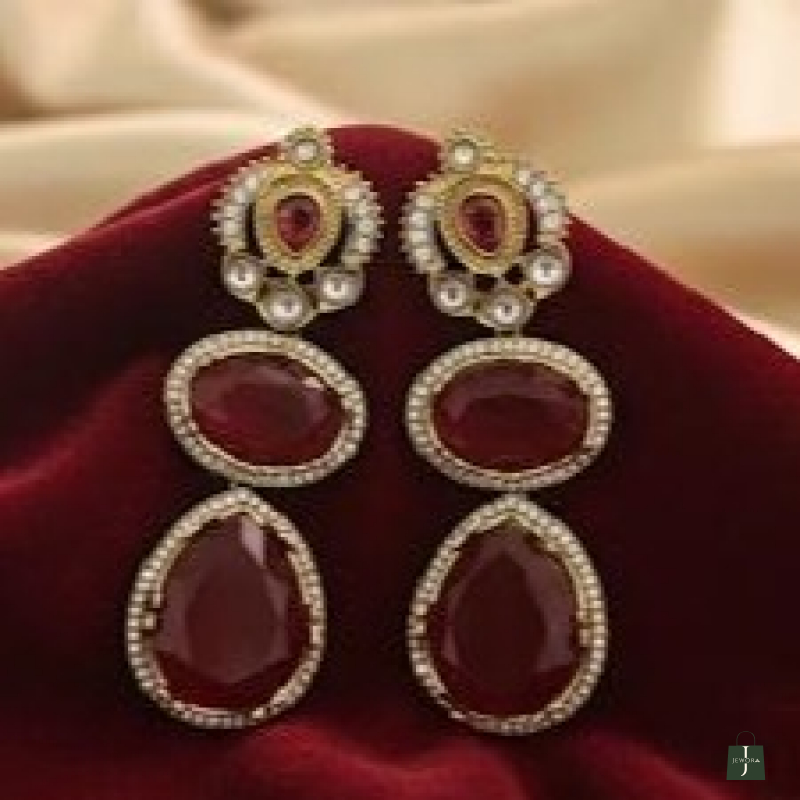 Exquisite triple-tier Polki dangles featuring vibrant, ruby-hued centerpieces. Handcrafted with a traditional Jadau technique, these earrings showcase a stunning progression from a brilliant floral stud to a grand pear-shaped drop. Each deep-red stone is meticulously framed by a halo of shimmering white Kundan stones, set in an antique gold-finish for a regal, heritage-inspired look."