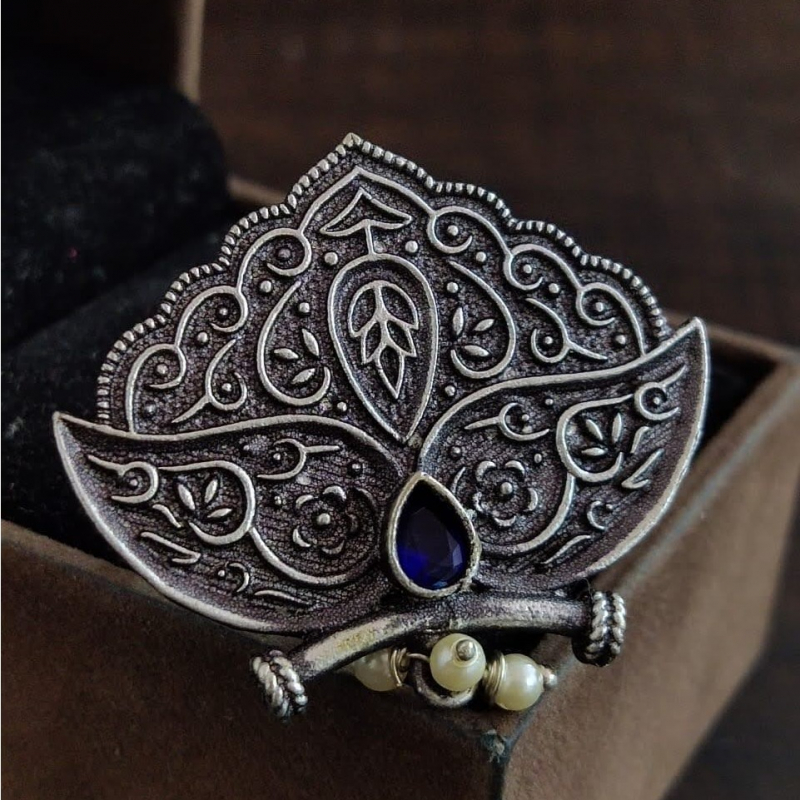 This stunning oxidized silver ring showcases a beautifully detailed lotus-inspired design, symbolizing purity and grace. The intricate engravings feature delicate floral and paisley patterns, giving it a rich traditional appeal. At the center sits a deep blue stone that adds a bold contrast, while tiny pearl-like beads enhance its charm with a soft, elegant finish. Perfect for festive occasions or statement styling, this ring effortlessly blends heritage craftsmanship with modern sophistication.