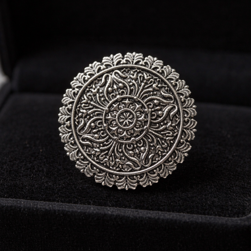 Elevate your style with this beautifully crafted oxidised statement ring, featuring an intricate mandala design that reflects timeless artistry. The detailed floral and swirl patterns create a captivating antique look, perfect for ethnic and fusion outfits. Made with high-quality alloy and finished in a classic oxidised silver polish, this ring offers durability along with elegance. Its bold circular structure makes it a standout accessory for festive occasions, casual outings, or traditional wear. Comfortable to wear and eye-catching in design, this ring is a must-have for those who love vintage-inspired jewelry with a modern twist.