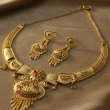 Exude timeless majesty with the Royal Swirl Heritage Choker, a masterpiece featuring a multi-strand mesh band and elegant paisley-swirl links. This gold-tone set is anchored by a stunning floral-centered pendant adorned with a luxurious cascading tassel drop. Paired with matching statement earrings, it offers a grand, high-impact silhouette perfect for weddings and prestigious celebrations.