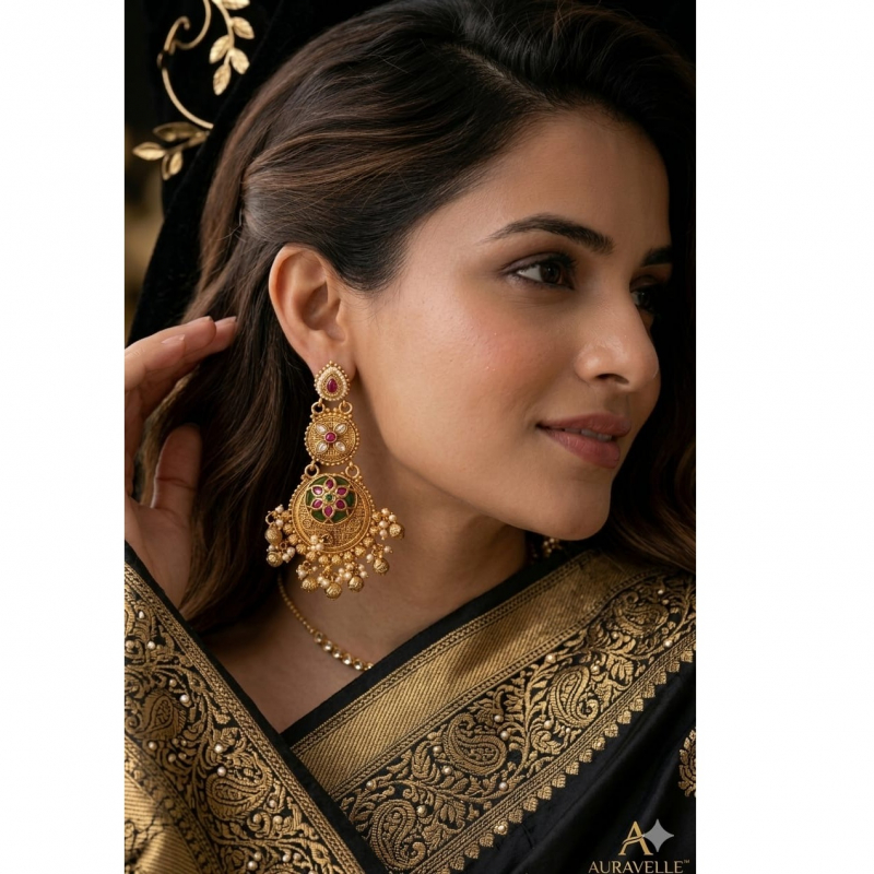 Add a touch of royal elegance to your look with these intricately designed antique gold earrings. Crafted with a stunning combination of ruby-toned stones and rich green onyx centerpiece, these earrings reflect timeless heritage artistry. The detailed floral motifs and delicate pearl hangings enhance their luxurious appeal, making them perfect for weddings, festive occasions, and ethnic celebrations.