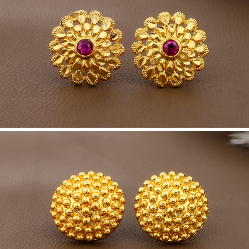 This luxurious gold stud earrings combo collection is designed to add charm and elegance to your jewelry box. Featuring six unique designs, the set includes floral studs, textured bead patterns, radiant circular motifs, and crystal-accented styles. The gold-plated finish gives each pair a premium look while ensuring durability and resistance to fading. Crafted from lightweight alloy material, these earrings are comfortable enough for daily wear while still making a statement during festive occasions. The colorful stone embellishments provide an attractive contrast to the gold tone, creating a sophisticated and eye-catching appearance.