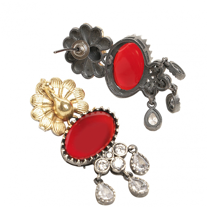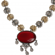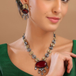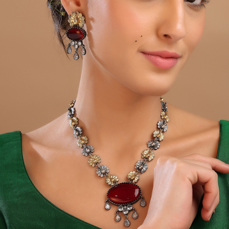 Enhance your ethnic charm with this beautifully crafted vintage-inspired necklace set. Featuring a bold oval-shaped scarlet red centerpiece, this design is complemented by delicate floral motifs in a stunning dual-tone finish of gold and silver. The intricate detailing gives it a timeless antique appeal, while the dangling crystal drops add a touch of graceful sparkle.