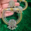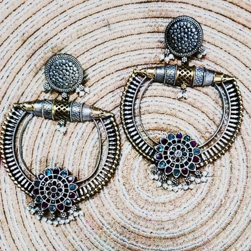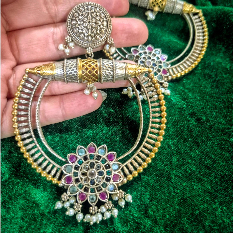Elevate your ethnic style with these stunning dual-tone chandbali earrings, inspired by traditional craftsmanship. Featuring a beautifully carved circular stud, the design extends into a bold hoop structure with intricate metal textures in silver and gold tones. The highlight is the vibrant floral motif at the base, adorned with multicolor stones and delicate pearl drops that add graceful movement. A perfect blend of heritage and contemporary styling, these earrings are ideal for festive occasions and statement
