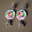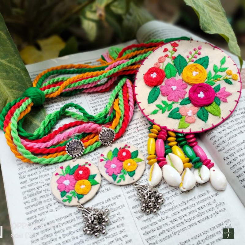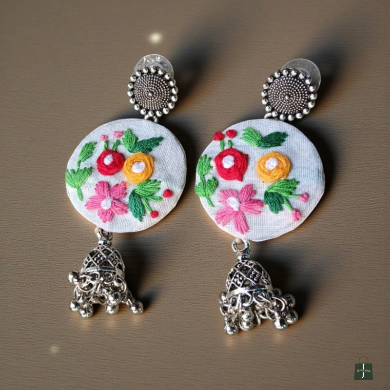Earrings: The matching earrings feature smaller, round fabric pieces with similar vibrant floral embroidery. They dangle from ornate, silver-toned metal Jhumka-style components, echoing traditional Indian designs.