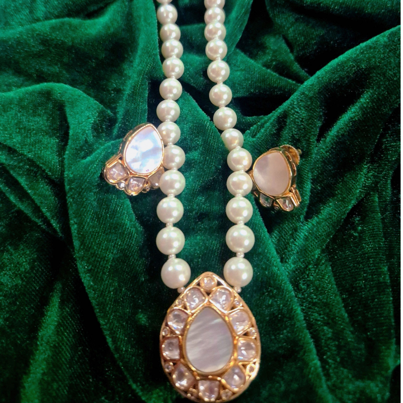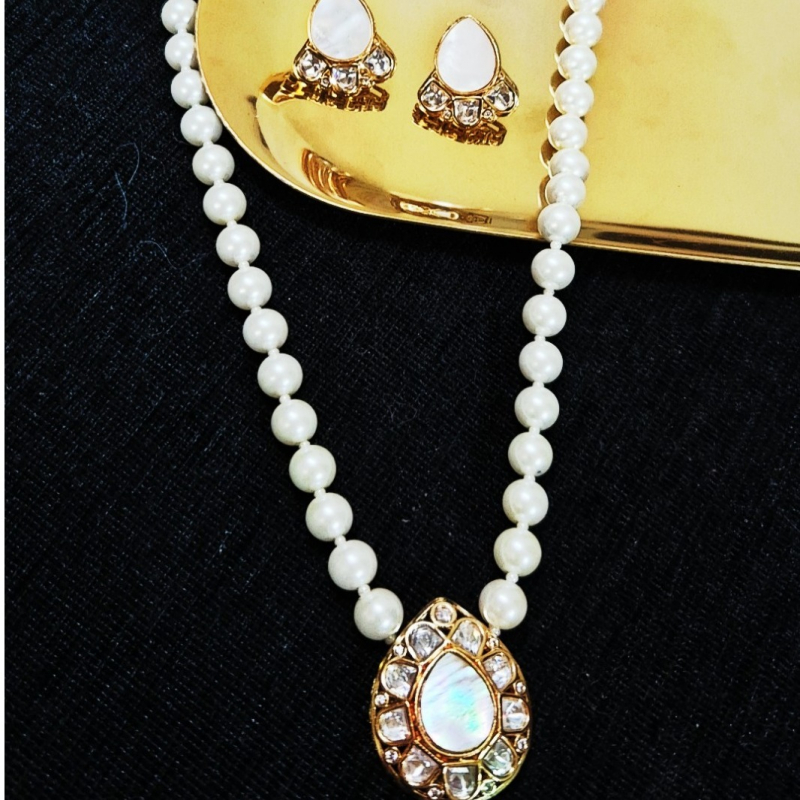 Enhance your elegance with the White Pearl Mala Necklace with Studs, a timeless jewelry set that exudes grace and sophistication. Crafted with lustrous white pearls, this necklace offers a classic and refined look that never goes out of style. The matching pearl studs perfectly complement the mala, creating a harmonious and polished appearance. Lightweight and versatile, it is ideal for both traditional and modern outfits, making it perfect for weddings, festive occasions, or everyday elegance. Its subtle shine and delicate design add a touch of charm, ensuring you look effortlessly graceful and beautifully put together wherever you go.