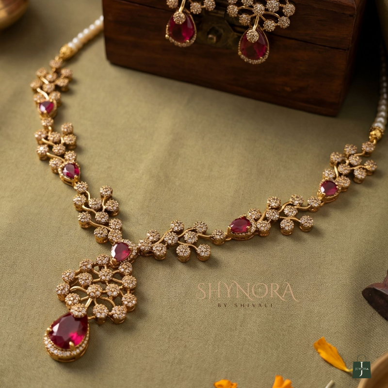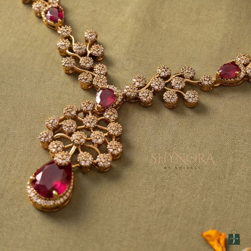 The Zara Ruby Bloom Necklace Set is a graceful statement piece crafted with deep ruby-red stones and sparkling crystal accents. The elegant vine-inspired necklace flows into a floral drop pendant, finished with a rich ruby teardrop that adds a touch of royalty. The matching earrings mirror the central design, creating a perfectly balanced and sophisticated look.