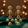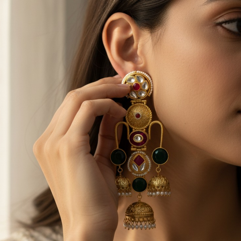 Elevate your festive look with these exquisite heritage-style jhumka danglers. Designed in a rich antique gold finish, these earrings feature a beautifully layered structure with kundan-style stones at the top, intricate textured gold detailing in the center, and deep green stone accents for royal contrast. The design gracefully flows into dome-shaped jhumkas adorned with delicate pearl bead fringes, adding traditional charm and movement. Perfect for weddings and grand festive occasions, these earrings are a true statement of timeless elegance.