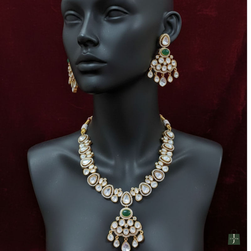 The ZARINA EMERALD KUNDAN NECKLACE SET is a timeless statement crafted with classic white kundan stones and highlighted by rich emerald-green accents, finished in an antique gold tone. Featuring an elegant central drop pendant and matching chandbali-style earrings, this set reflects regal Rajwadi charm with a refined modern touch. Perfect for weddings, festive occasions, bridal functions, and evening celebrations, it pairs beautifully with silk sarees, lehengas, and traditional ethnic wear for a luxurious, royal look.