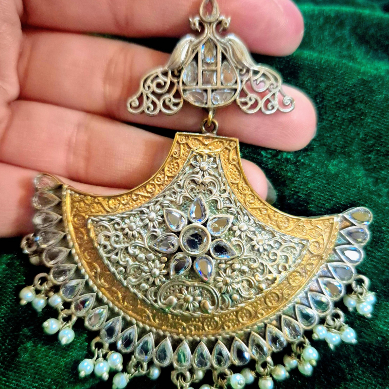 Make a bold traditional statement with these intricately designed dual-tone chandbali earrings. Featuring a beautiful blend of antique silver and gold polish, the earrings showcase detailed floral engravings paired with shimmering kundan-style stones. The crescent-shaped design is enhanced with delicate pearl danglers, adding graceful movement and elegance. Perfect for weddings and festive occasions, these earrings bring a regal charm to your ethnic ensemble.