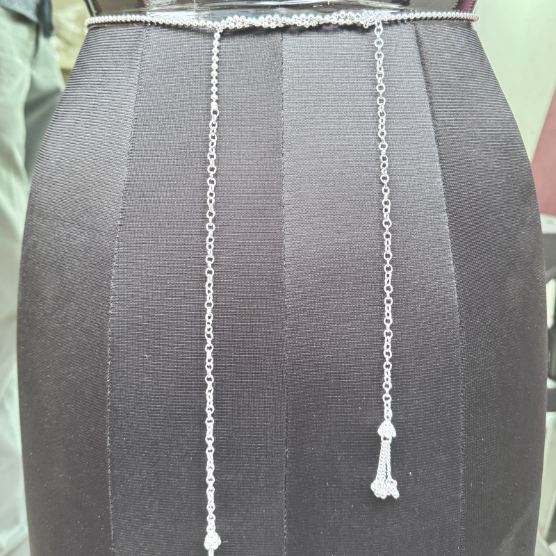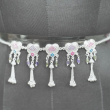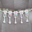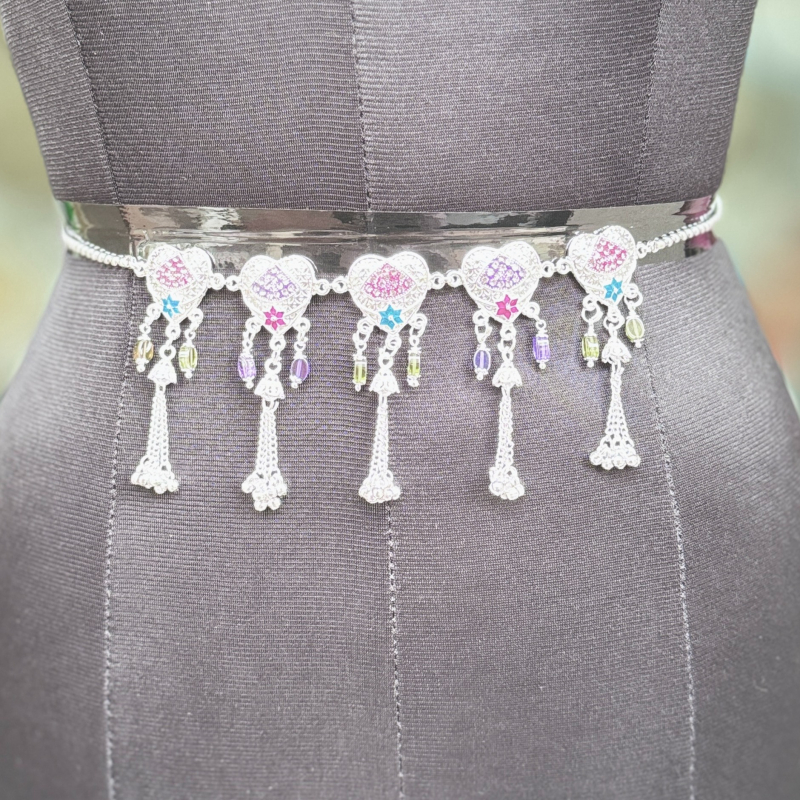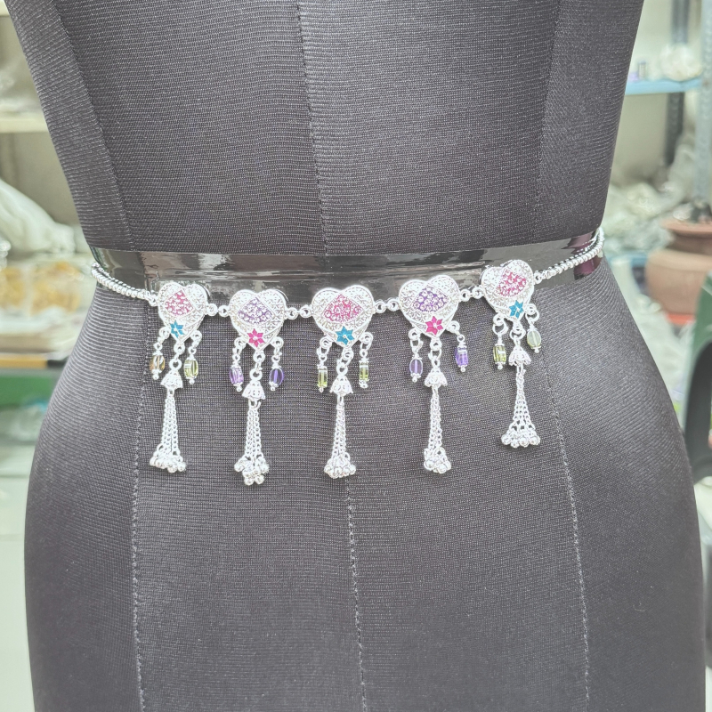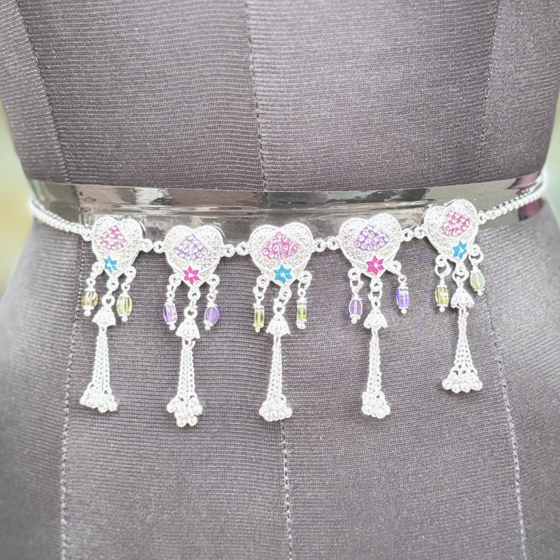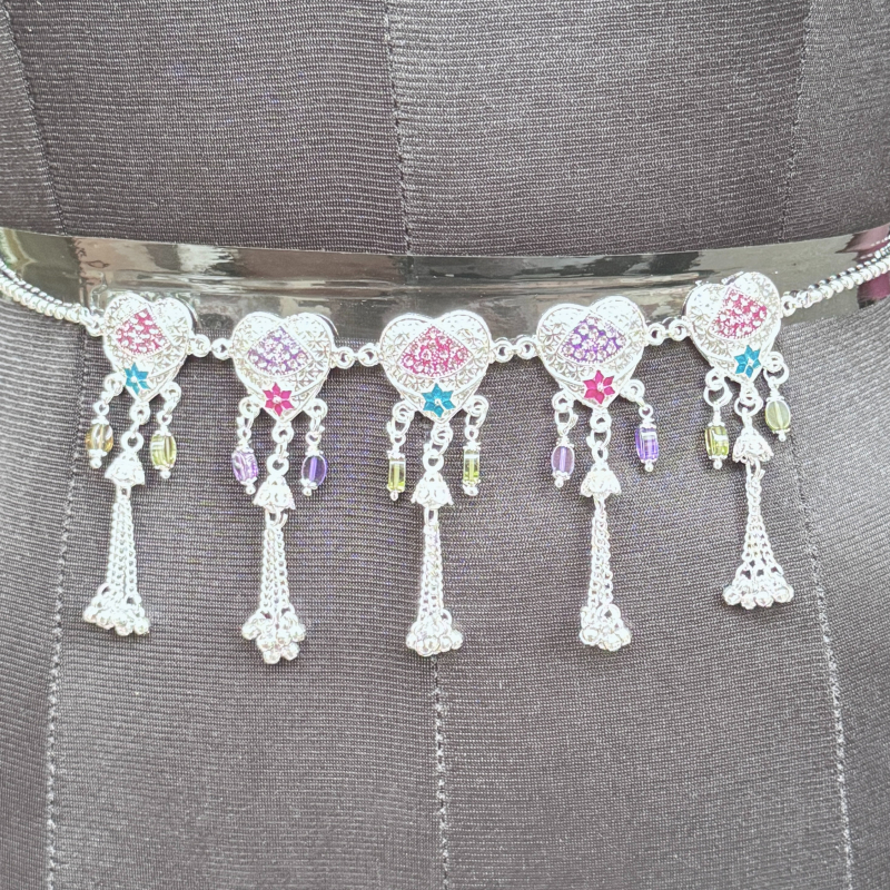 This graceful silver-tone necklace features a sequence of delicately crafted heart-shaped motifs highlighted with colorful enamel accents. Each motif is embellished with small star-shaped details and elegant bead drops in soft pastel tones, creating a vibrant yet sophisticated look. The flowing tassel chains add movement and charm, while the dual-chain design enhances its modern ethnic appeal. Lightweight and stylish, this necklace is perfect for festive occasions, casual ethnic outfits, and special gatherings.