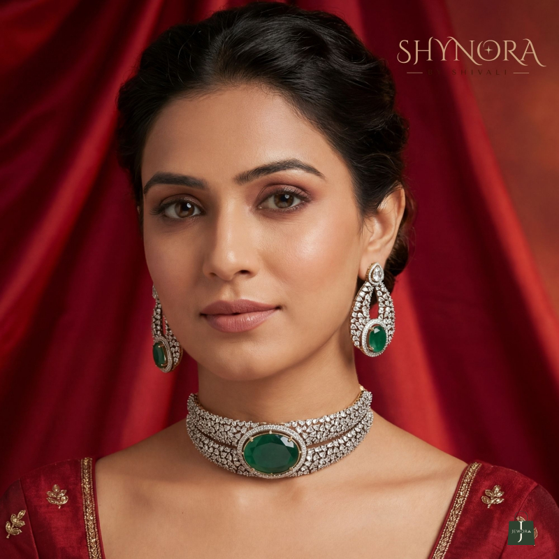 Paired with matching drop earrings that echo the emerald centerpiece, this set is perfect for cocktail nights, receptions, and statement festive looks where minimal drama speaks luxury.