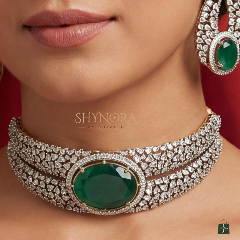 The Zeenat Emerald Crystal Choker Set is a bold yet elegant statement crafted for modern royalty. Featuring a broad crystal-studded choker, this design is highlighted with a striking oval emerald-green center stone framed in fine gold detailing. The layered sparkle adds richness while keeping the silhouette clean and powerful.