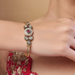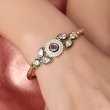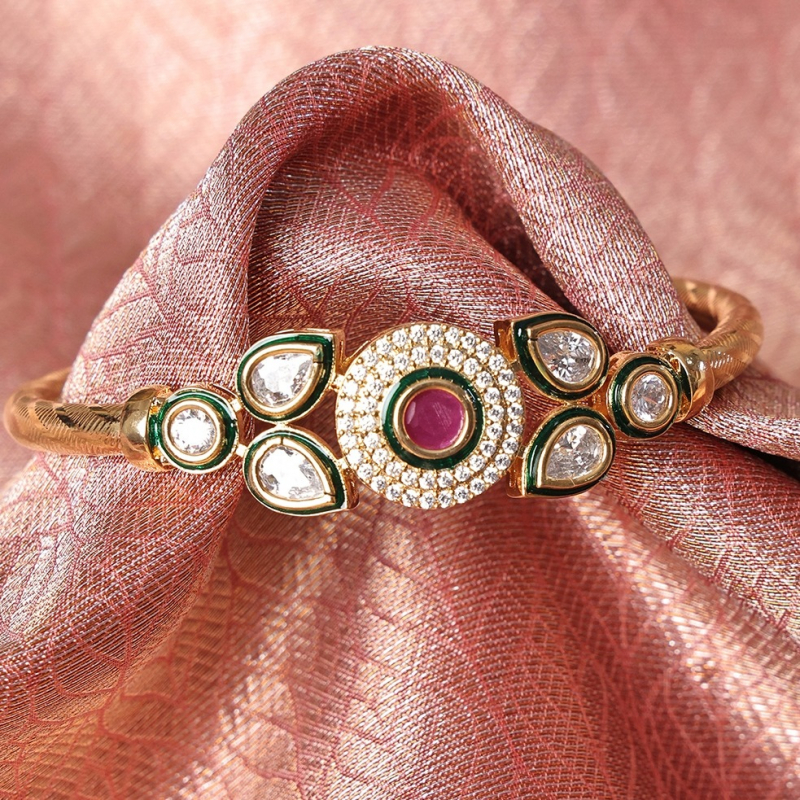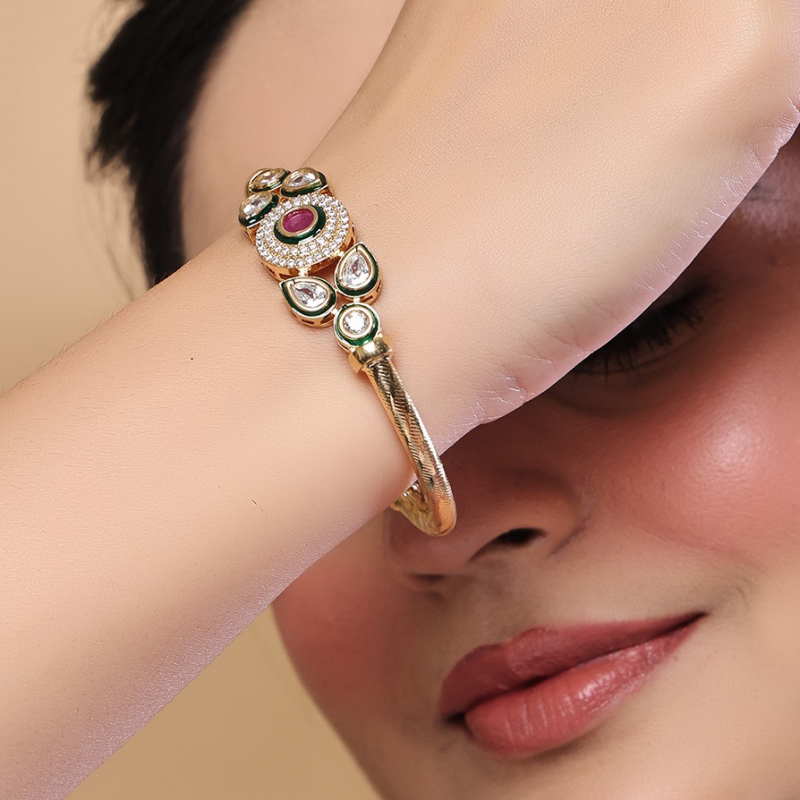 Add a regal touch to your look with this beautifully crafted kundan kada bracelet. Designed with a statement centerpiece, it features a rich ruby-toned stone surrounded by shimmering kundan work and delicate green enamel accents. The intricate detailing and textured gold band enhance its traditional charm while maintaining a modern appeal. Perfect for festive occasions, weddings, and special events, this bracelet effortlessly elevates any ethnic outfit.