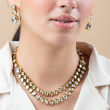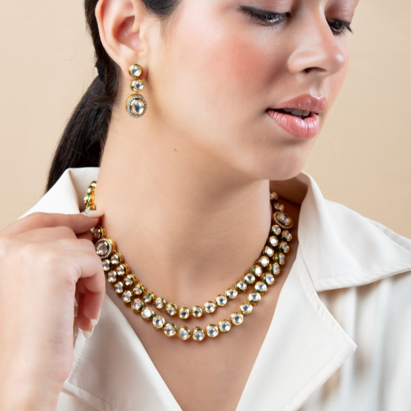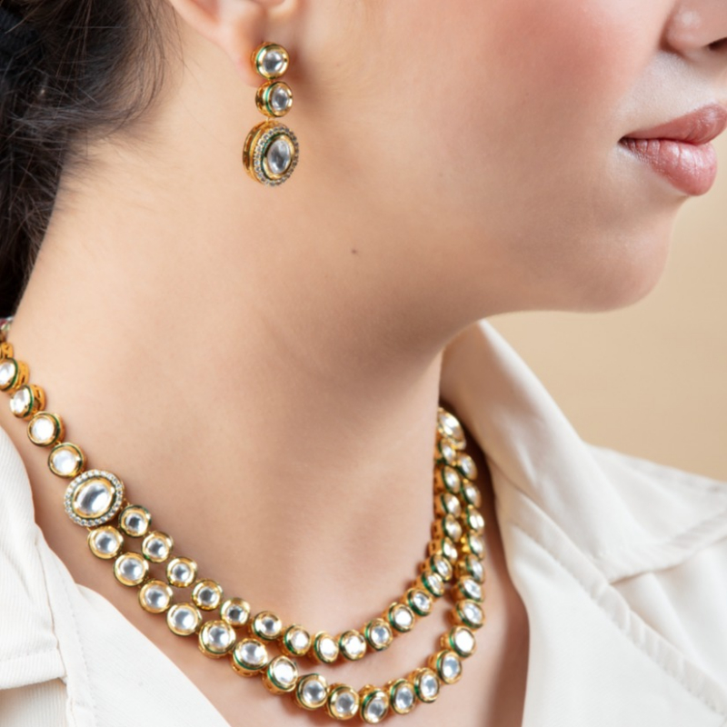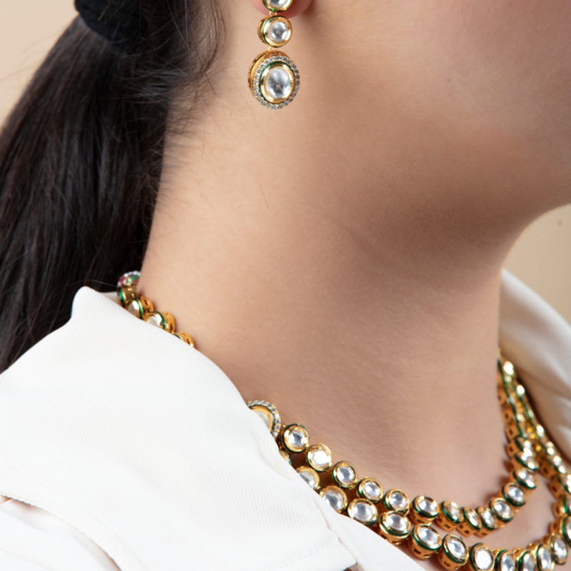 The jewelry in this image features a multi-layered Kundan necklace set with matching earrings, offering a sophisticated and regal look.The layers of Kundan stones are connected gracefully, forming a cascading effect.