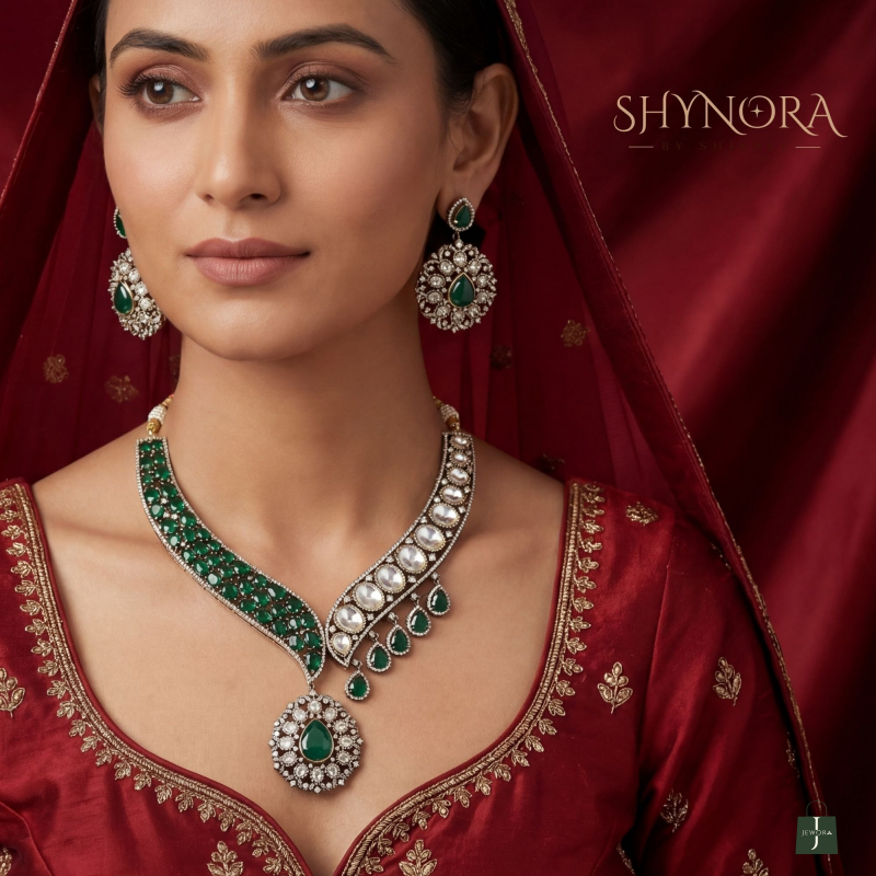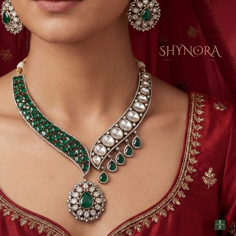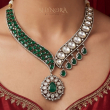 At the center sits a bold emerald teardrop pendant, framed with shimmering kundan work that adds depth and brilliance. The matching statement earrings mirror the pendant’s design, completing a look that is graceful yet powerfully distinctive.