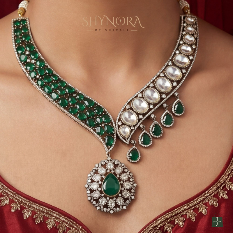 The Zehra Emerald Veil Kundan Necklace Set is a striking fusion of modern asymmetry and royal tradition. Designed with a unique dual-pattern neckline, one side is richly encrusted with emerald-green stones, while the other features classic kundan crystals finished with elegant green teardrop danglers.