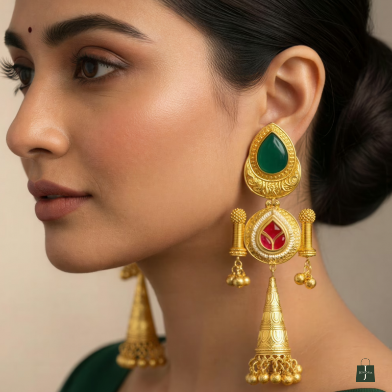 The Zehra Kashmiri Jhumka Earrings celebrate traditional Kashmiri craftsmanship with a bold yet graceful silhouette. Designed with a rich green teardrop stone at the top, these earrings transition into a delicately detailed circular motif highlighted by ruby-red accents and pearl-style borders.