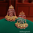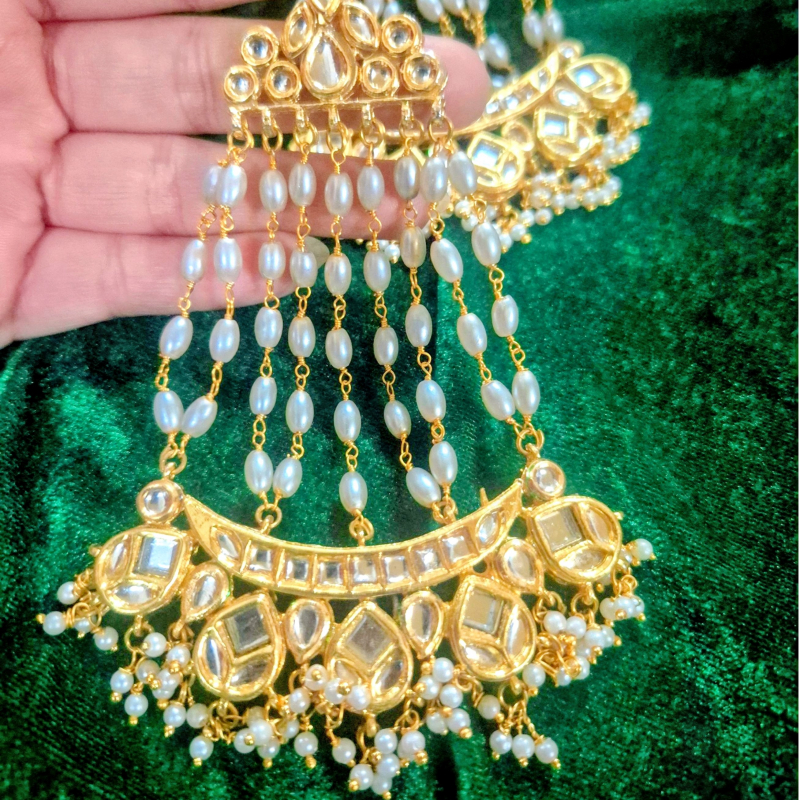 Make a grand statement with these luxurious kundan chandbali earrings, designed with intricate craftsmanship and timeless elegance. The top features a detailed kundan stud that flows into multiple cascading pearl strings, creating a graceful layered effect. The crescent-shaped base is adorned with finely set kundan stones and delicate pearl drops, adding richness and movement to the design. Perfect for weddings and festive occasions, these earrings bring a regal charm to any traditional outfit.