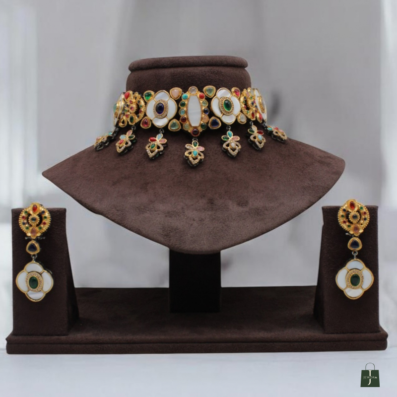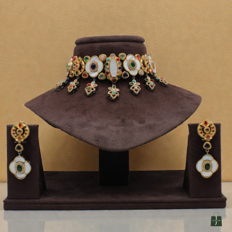 Elevate your festive and bridal look with this stunning multicolour floral choker set. Designed with a rich antique gold finish, the choker features elegant oval and floral motifs adorned with white stones and vibrant coloured accents. The delicate hanging charms add graceful movement and enhance the traditional appeal of the piece.