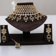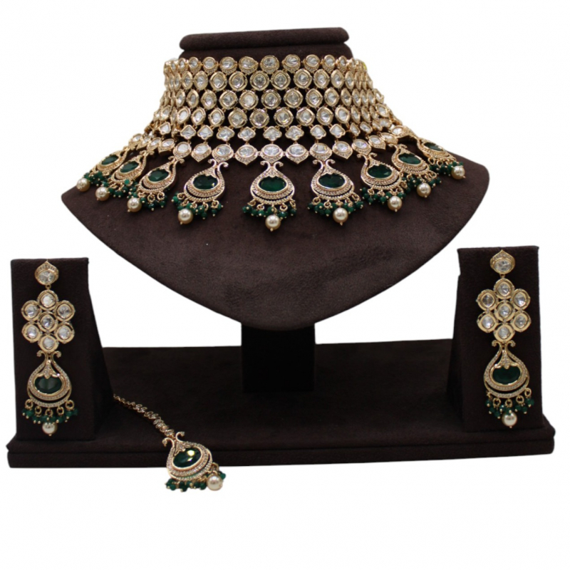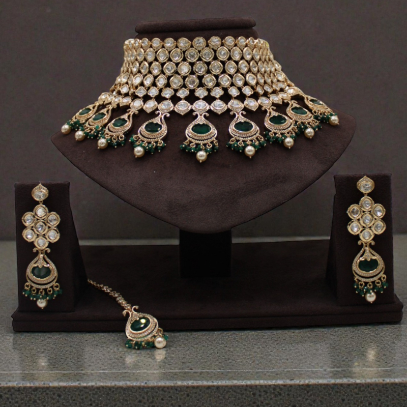 This set includes matching long statement earrings and a coordinating maang tikka, making it a perfect bridal ensemble for weddings, receptions, and festive occasions. It pairs beautifully with lehengas, sarees, and traditional ethnic outfits.