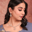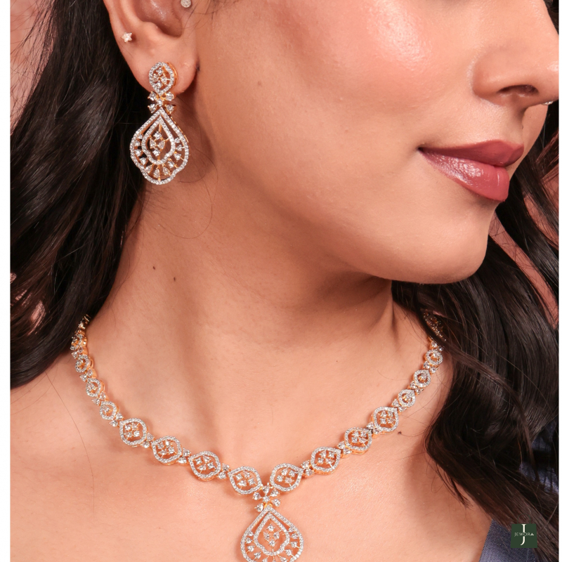 Elevate your elegance with the Zohira Luxe CZ Necklace Set—a breathtaking blend of sophistication and sparkle. This exquisite set features a delicately crafted teardrop pendant necklace and matching earrings, both adorned with premium cubic zirconia stones that mimic the brilliance of real diamonds. The warm rose-gold plating enhances the intricate lattice design, making it a perfect choice for weddings, festive occasions, or any event where you want to shine.